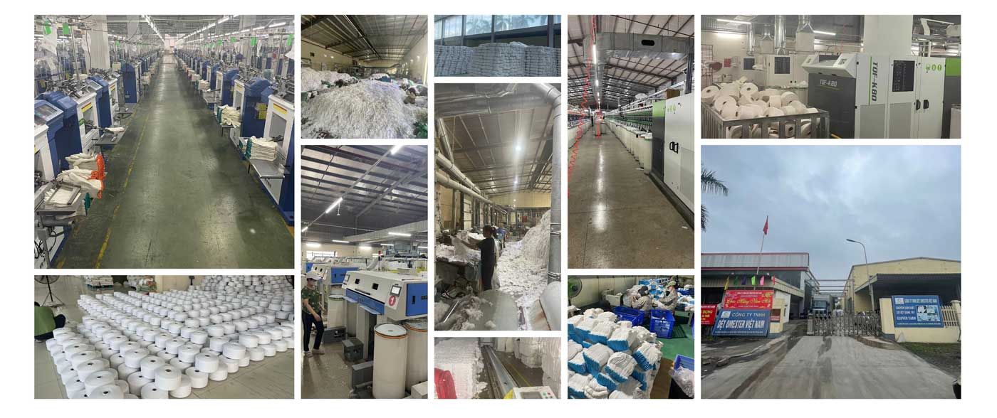 Là một công ty chuyên sản xuất sợi tái sinh và găng tay bảo hộ lao động, được thành lập năm 2016 ở tỉnh Hải Dương, cách thủ đô Hà Nội 80km, cách cảng Hải Phòng 35 km, có ưu thế về vị trí địa lý. Chúng tôi sản xuất sợi tái sinh thông qua kiểm chứng GRS. Nguyên vật liệu là vải vụn từ những nhà máy may mặc, lợi dụng để tái chế, giảm thiểu khí thải cacbon, bảo vệ môi trường Trái đất một cách hiệu quả. Chúng tôi sử dụng máy móc công nghệ đặc biệt để biến vải vụn thành sợi bông tái chế, biến chúng thành nguyên liệu chủ yếu trong sản xuất. Chúng tôi sử dụng máy móc công nghệ đặc biệt để biến vải vụn thành sợi bông tái chế, biến chúng thành nguyên liệu chủ yếu trong sản xuất. Đầu tư nhập khẩu hệ thống máy SAUREN từ Thuỵ Sỹ, hệ thống máy dệt sợi TAITAN (OE) từ Trung Quốc với 2100 suốt và máy dệt găng tay tốc độ cao hoàn toàn tự động.
